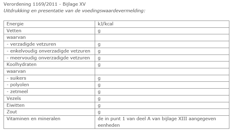 In de volgende tabel ziet u welke volgorde en eenheden u in de presentatie van de voedingswaarde aanhoudt. Is er te weinig ruimte voor een tabel, dan mag de informatie achter elkaar worden geplaatst (tekstregels). Houdt u hierbij wel de juiste volgorde en eenheden aan.