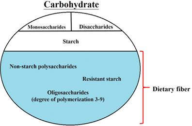 Figuur 1. Verschillende soorten koolhydraten onderverdeeld in verteerbare koolhydraten (wit) en vezels (blauw). Bron: Dai & Chau, 2017.