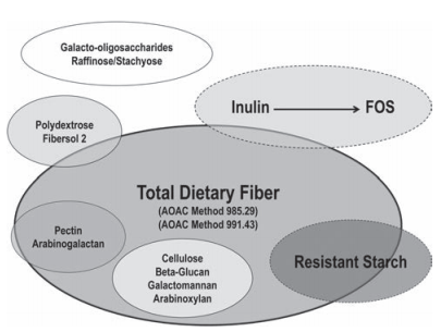 Figuur 2. Vezelcomponenten die wel, niet of gedeeltelijk worden geanalyseerd met AOAC Methode 991.43. Alle componenten worden meegenomen in de AOAC Methode 2009.01. Bron: McCleary & Cox, 2017.